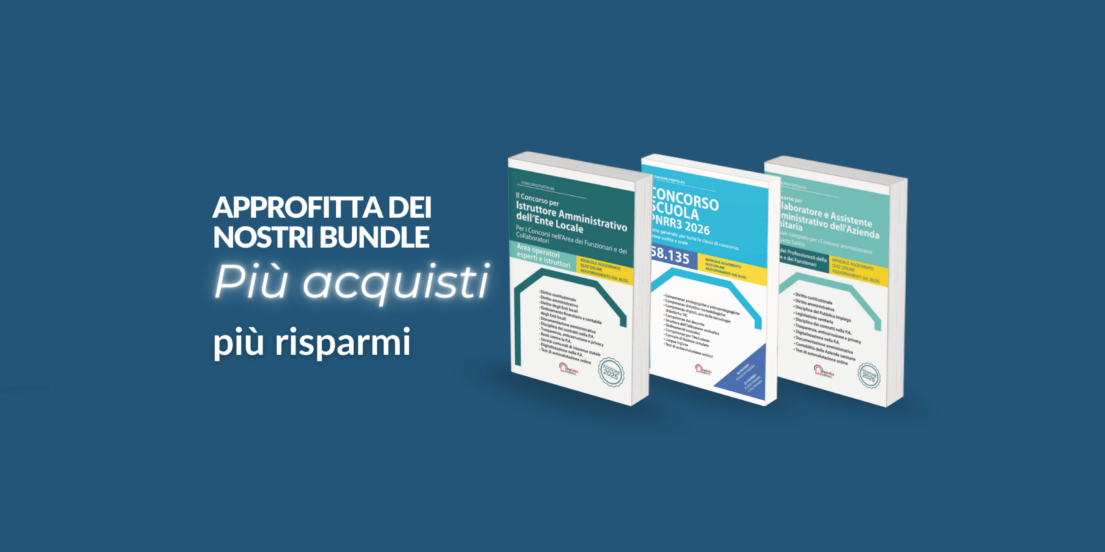 Approfitta delle nostre promo bundle : acquista 3 compendi della stessa Collana per concorsi pubblici, paghi solo il 50% sul terzo, sia in formato cartaceo che in formato eBook.