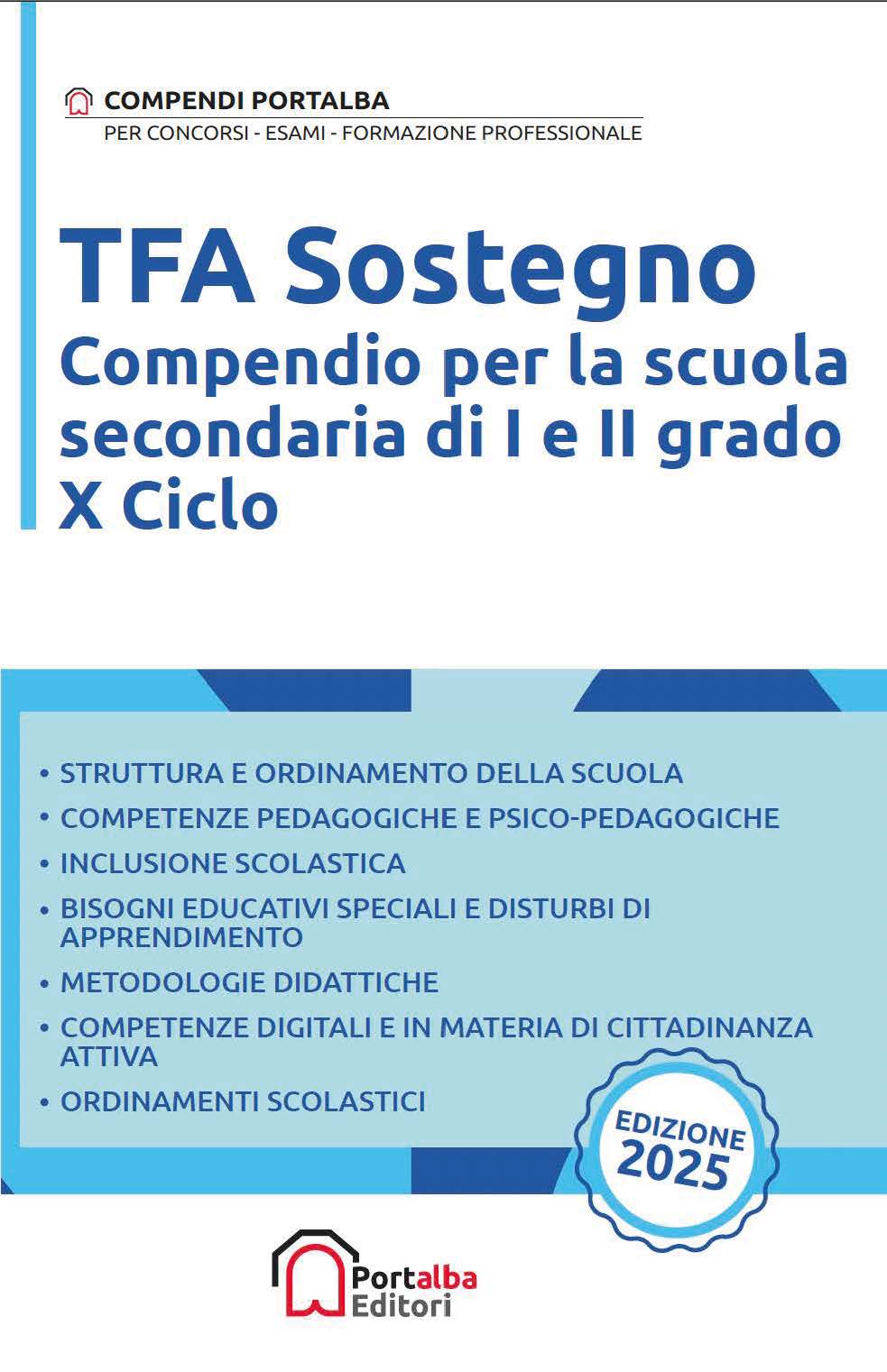 PARTE I - LE COMPETENZE PEDAGOGICHE - 1 - Identità della pedagogia ed evoluzione storica dei modelli pedagogici: 1.1 Introduzione alla pedagogia; 1.2 La pedagogia dalle origini al XVII secolo; 1.2.1 Agostino d’Ippona; 1.2.2 Tommaso d’Aquino; 1.2.3 Comenio; 1.2.4 Cartesio; 1.3 La pedagogia illuminista; 1.3.1 John Locke; 1.3.2 Étienne Bonnot de Condillac; 1.3.3 Nicolas de Condorcet; 1.3.4 Giambattista Vico; 1.3.5 Jean-Jacques Rousseau; 1.4 La pedagogia romantica; 1.4.1 Johann Heinrich Pestalozzi; 1.4.2 Friedrich Wilhelm August Fröbel; 1.4.3 Johann Friedrich Herbart; 1.4.4 Ferrante Aporti; 1.4.5 Giovanni Bosco; 1.5 Le new schools; 1.5.1 Adolphe Ferrière; 1.5.2 Edouard Claparéde; 1.5.3 Rosa e Carolina Agazzi; 1.5.4 Ovide Decroly; 1.5.5 John Dewey; 1.5.6 William Kilpatrick; 1.5.7 Célestin Freinet; 1.5.8 Paulo Freire; 1.5.9 Roger Cousinet; 1.5.10 Maria Montessori; 1.5.11 Lorenzo Milani; 1.5.12 Giovanni Gentile; 1.5.13 Danilo Dolci. 2 - Teorie e stili di apprendimento: 2.1 Il comportamentismo; 2.1.1 Il riflesso condizionato di Pavlov; 2.1.2 Karl Lashley; 2.1.3 John Watson; 2.1.4 Il condizionamento strumentale di Thorndike; 2.1.5 Il condizionamento operante e rispondente di Skinner; 2.2 Il Neo-comportamentismo; 2.2.1 Edward C. Tolman; 2.2.2 Clark L. Hull; 2.3 Clotilde Pontecorvo; 2.4 Elio Damiano; 2.5 Il cognitivismo; 2.5.1 La Psicologia della Gestalt; 2.5.2 Max Wertheimer; 2.5.3 Wolfgang Köhler; 2.5.4 L’Human Information Processing (HIP); 2.5.5 La teoria metacognitiva; 2.6 Il costruttivismo; 2.6.1 George Kelly; 2.6.2 Ernst von Glasersfeld; 2.6.3 Humberto Maturana; 2.7 Heinz von Foerster; 2.8 Teorie e stili di apprendimento; 2.8.1 Robert Sternberg; 2.8.2 Gregory Bateson; 2.8.3 Albert Bandura; 2.9 L’apprendimento significativo; 2.9.1 Carl Rogers; 2.9.2 David Jonassen; 2.9.3 David Ausubel; 2.9.4 Joseph Novak; 2.10 L’apprendimento esperienziale: David Kolb; 2.10.1 L’apprendimento esperienziale: Peter Jarvis; 2.11 L’apprendimento cognitivo-sociale: Walter Mischel; 2.12 Benjamin Bloom; 2.13 Edgar Morin; 2.14 Robert Mills Gagné; 2.15 Tony Buzan; 2.16 Donald O. Hebb; 2.17 Diana Laurilland; 2.18 Endel Tulving; 2.19 Reuven Feuerstein; 2.20 Luciano Mariani e Gabriella Pozzo; 2.21 Philip Candy; 2.22 Hermann Ebbinghaus; 2.23 Alfred Binet; 2.24 Donald Schon; 2.25 Alfredo Giunti; 2.26 Willem Doise; 2.27 Il metodo multisensoriale; 2.28 Il modello Felder-Silverman; 2.29 Etienne Wenger; 2.30 Michel Develay; 2.31 Funzionalismo e strutturalismo; 2.31.1 Wilhelm Wundt; 2.31.2 Edward Titchener; 2.31.3 Émile Durkheim. PARTE II - LE COMPETENZE PSICO-PEDAGOGICHE - 1 - Psicologia dello sviluppo: 1.1 Jean Piaget; 1.1.1 Lo stadio senso-motorio; 1.1.2 Lo stadio preoperatorio; 1.1.3 Lo stadio delle operazioni concrete; 1.1.4 Lo stadio delle operazioni formali; 1.2 Lev Semenovic Vygotskij; 1.2.1 Il linguaggio egocentrico come forma esterna del linguaggio interiore; 1.2.2 Il linguaggio come autovalutazione e autoregolazione; 1.2.3 Il linguaggio sociale; 1.3 Jerome Bruner; 1.4 Le competenze psico-pedagogiche di Piaget, Vygotskij e Bruner; 1.5 Sergej Hessen; 1.6 Le neuroscienze; 1.6.1 Giacomo Rizzolatti; 1.7 Le teorie psicanalitiche; 1.7.1 Sigmund Freud; 1.7.2 Alfred Adler; 1.7.3 Erik Erikson; 1.7.4 James Marcia; 1.7.5 Anna Freud e Melanie Klein; 1.7.6 Heinz Kohut; 1.7.7 Jacques Lacan; 1.7.8 Donald Winnicott; 1.7.9 René Spitz; 1.7.10 Margaret Mahler; 1.7.11 Daniel Stern; 1.8 La psicologia dell’adattamento; 1.8.1 John Bowlby; 1.8.2 Mary Ainsworth; 1.8.3 Harry Harlow; 1.9 Urie Bronfenbrenner; 1.10 Lo sviluppo morale; 1.10.1 Lawrence Kohlberg; 1.10.2 Carol Gilligan; 1.11 La psicologia sociale; 1.11.1 Gordon Allport; 1.11.2 Kurt Lewin; 1.12 Bluma Zeigarnik; 1.13 Sviluppo del linguaggio; 1.13.1 Noam Chomsky; 1.13.2 Uta Frith; 1.14 Persuasione e influenza sociale: Robert Cialdini. 2 - Intelligenza emotiva, creatività e personalità: 2.1 L’empatia; 2.1.1 Martin Hoffman; 2.1.2 Norma Feshbach; 2.1.3 Karla McLaren; 2.1.4 Simon Baron-Cohen; 2.1.5 Klassen time; 2.1.6 Test per misurare l’empatia; 2.1.7 Life skills; 2.2 Le emozioni e le teorie sullo sviluppo emotivo; 2.2.1 Albert Ellis; 2.2.2 Nico Frijda; 2.2.3 L. Alan Sroufe; 2.2.4 William James tra coscienza ed emozione; 2.2.5 Carroll E. Izard; 2.3 La teoria delle intelligenze multiple: Howard Gardner; 2.4 La teoria delle tre intelligenze di Sternberg; 2.5 Teorie sull’intelligenza emotiva; 2.5.1 Daniel Goleman; 2.5.2 Paul Ekman; 2.5.3 Reuven Bar-On; 2.5.4 Robert Selman; 2.5.5 Otto Gross; 2.6 Peter Salovey e John Mayer; 2.7 Perspective taking; 2.8 Metodo Edumovement; 2.9 Alessitimia; 2.10 Social referencing; 2.11 Test sull’intelligenza emotiva; 2.12 Creatività e pensiero divergente; 2.12.1 Teresa Amabile; 2.12.2 J. Paul Guilford; 2.12.3 Silvano Arieti; 2.12.4 Edward de Bono; 2.12.5 Graham Wallas; 2.12.6 Joseph Rossman; 2.12.7 John Gottman; 2.12.8 Sarnoff Mednick; 2.12.9 Paul Torrance; 2.12.10 Dillon; 2.12.11 Nina Lieberman; 2.12.12 Mario Mencarelli; 2.12.13 Frank Williams; 2.12.14 Hubert Jaoui; 2.12.15 Il concassage; 2.13 La comunicazione; 2.13.1 Paul Watzlawick; 2.13.2 Thomas Gordon; 2.14 La personalità; 2.14.1 Henry Murray; 2.14.2 Abraham Maslow; 2.14.3 Erich Fromm; 2.14.4 Raymond Cattell; 2.14.5 Claudio Galeno; 2.15 Le teorie fattoriali; 2.15.1 Hans Jürgen Eysenck; 2.16 La teoria dei Big five; 2.17 La teoria dei bisogni: David McClelland; 2.18 CASEL (Collaborative for Academic Social and Emotional). PARTE III - IL SOSTEGNO E LE SUE CARATTERISTICHE - Capitolo 1 - Il sostegno: 1.1 Il docente di sostegno; 1.2 La didattica inclusiva; 1.3 I concetti di disabilità, menomazione ed handicap; 1.4 Gli strumenti di classificazioni internazionali di disabilità; 1.5 Altri strumenti di classificazione; 1.6 Le disabilità descritte nel DSM-5; 1.6.1 Disabilità intellettiva e disturbi dello sviluppo intellettivo; 1.6.2 Disabilità psicofisica; 1.6.3 Disturbo dello spettro autistico; 1.6.4 Disturbi del linguaggio; 1.6.5 Disabilità sensoriali; 1.6.6 Disturbo da Defi
